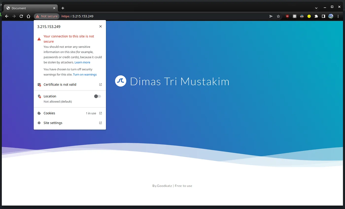 Pada percobaan ini, saya mencoba untuk melakukan pengamanan sebuah situs menggunakan sertifikat SSL yang saya tanda tangani ( sign ) sendiri. Situs yang menjadi bahan eksperimen saya dihosting menggunakan Ubuntu versi 20.04 dengan memanfaatkan layanan AWS. Berikut merupakan screenshot dari situs yang akan diamankan menggunakan SSL/TLS.